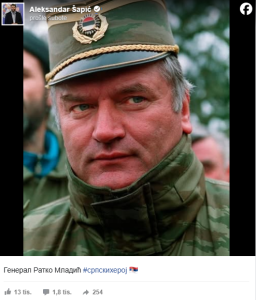 Šapić je 18. aprila na svom zvaničnom Facebook nalogu objavio Mladićevu fotografiju uz poruku „srpski heroj“.